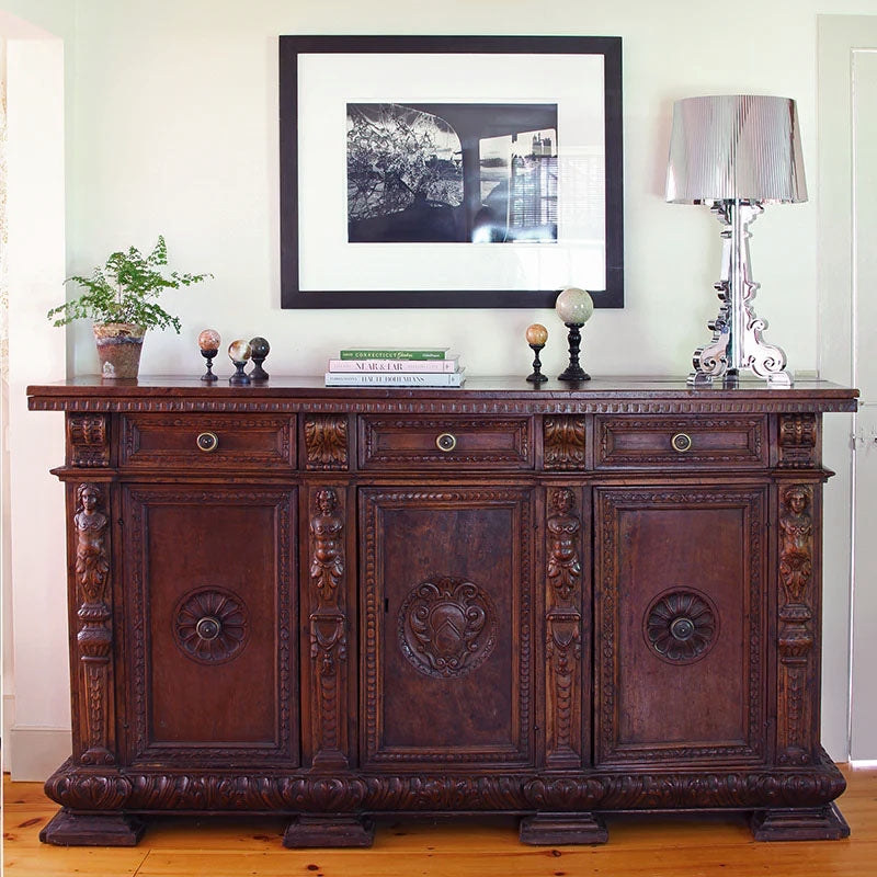 Florentine 17th Century carved credenza in walnut with original bronze hardware and hinges. Three cabinet doors, three drawers and four secret drawers. There is one original interior shelf inside the three doors that extends the entire width of the cabinet. An exquisite, statement piece that will make the room.