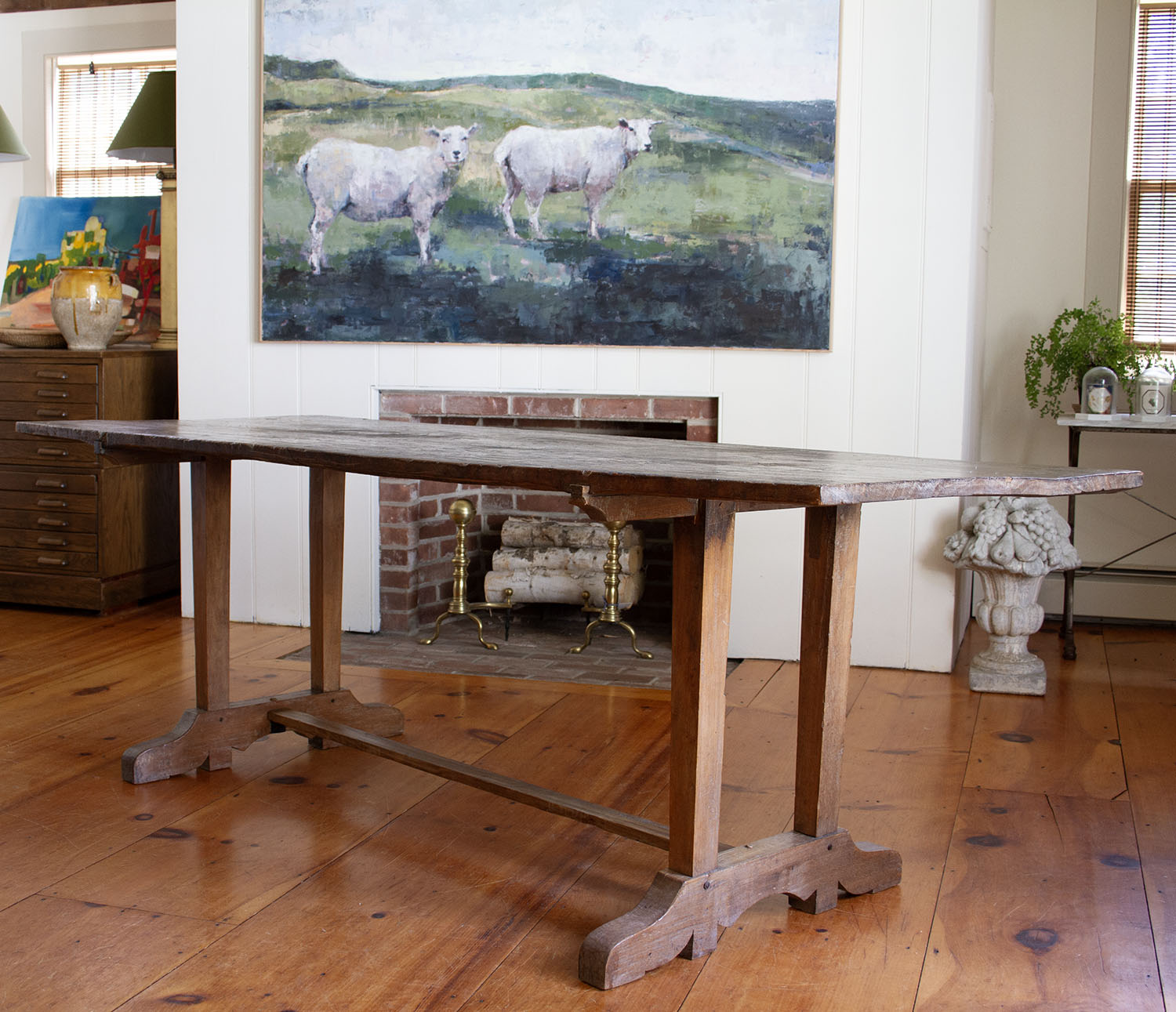 A Northern European trestle table with an extraordinary top made of one plank of wood with unique graining movement. The 1 1/4" thick top is gracefully beveled on the underside so the reveal on each side is 1" thick. The two legs are notched into the top with one stretcher that spans the width of the table at the bottom. The legs and feet have mortise and tenon joints. A waxed finish with a beautiful, original patina. The table is perfect for a kitchen or dining table size and can sit 6-8 comfortably. Great condition.