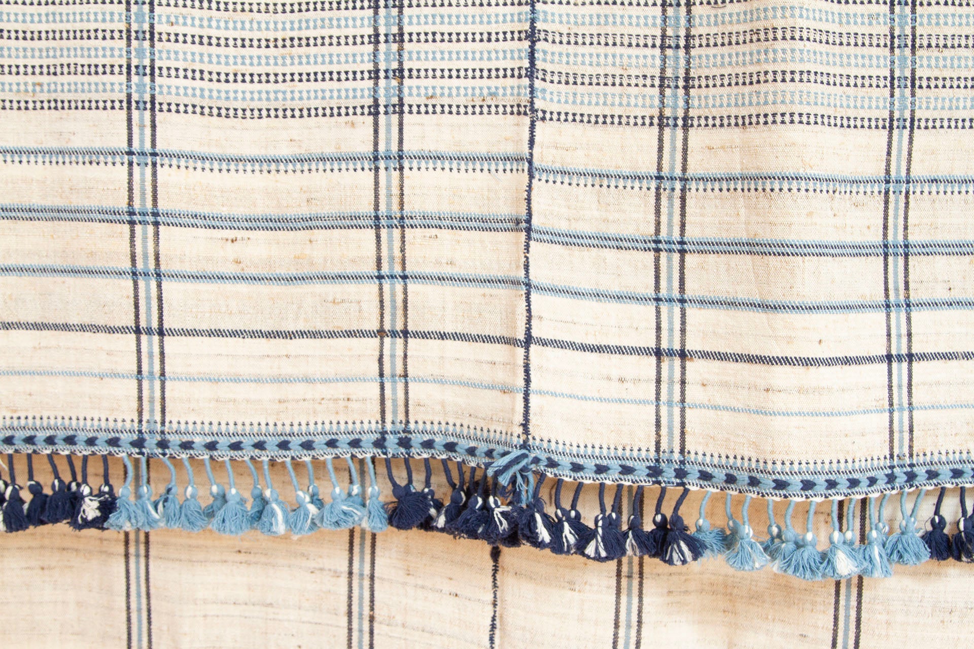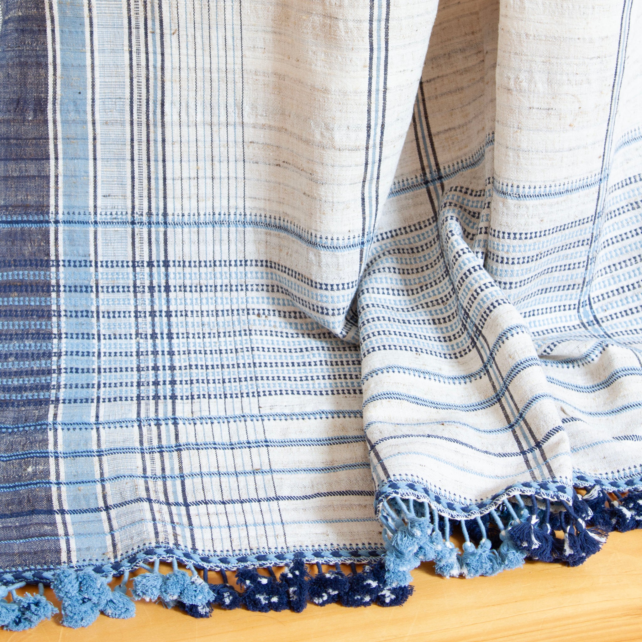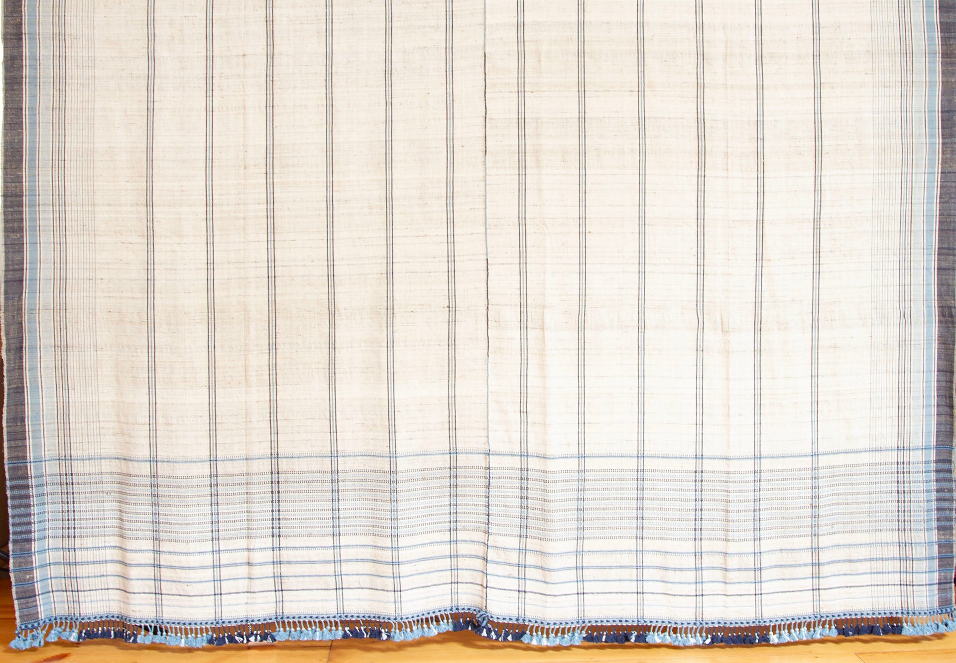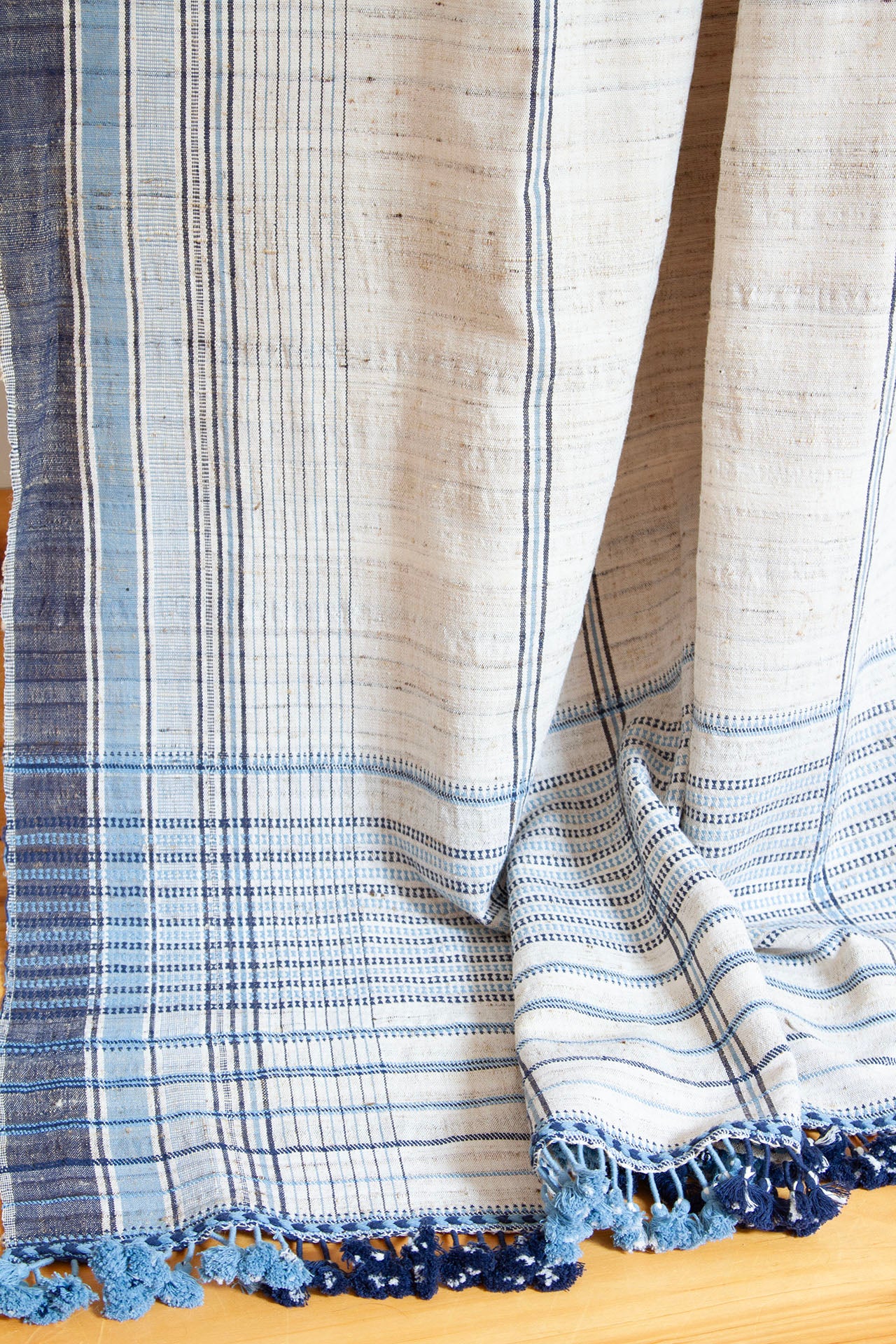 A hand-spun and handwoven, silk and cotton bedcover with woven vertical stripes and sky blue and navy wrapped tassels. Woven in three panels, this bedcover is then pieced together with hand embroidery, with vertical stripes running on two sides. Designed by Curated Accents and made in Kutch, India.