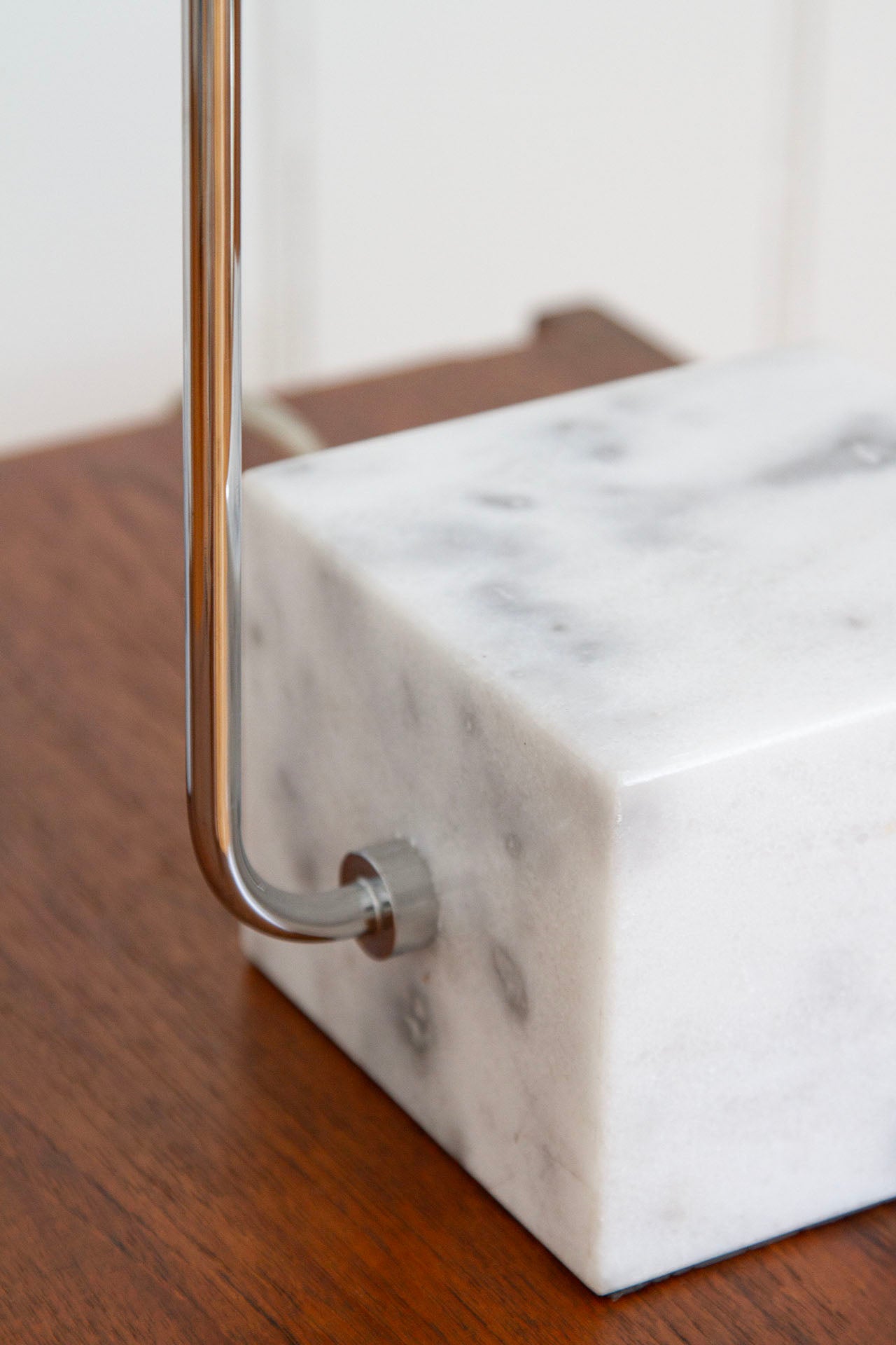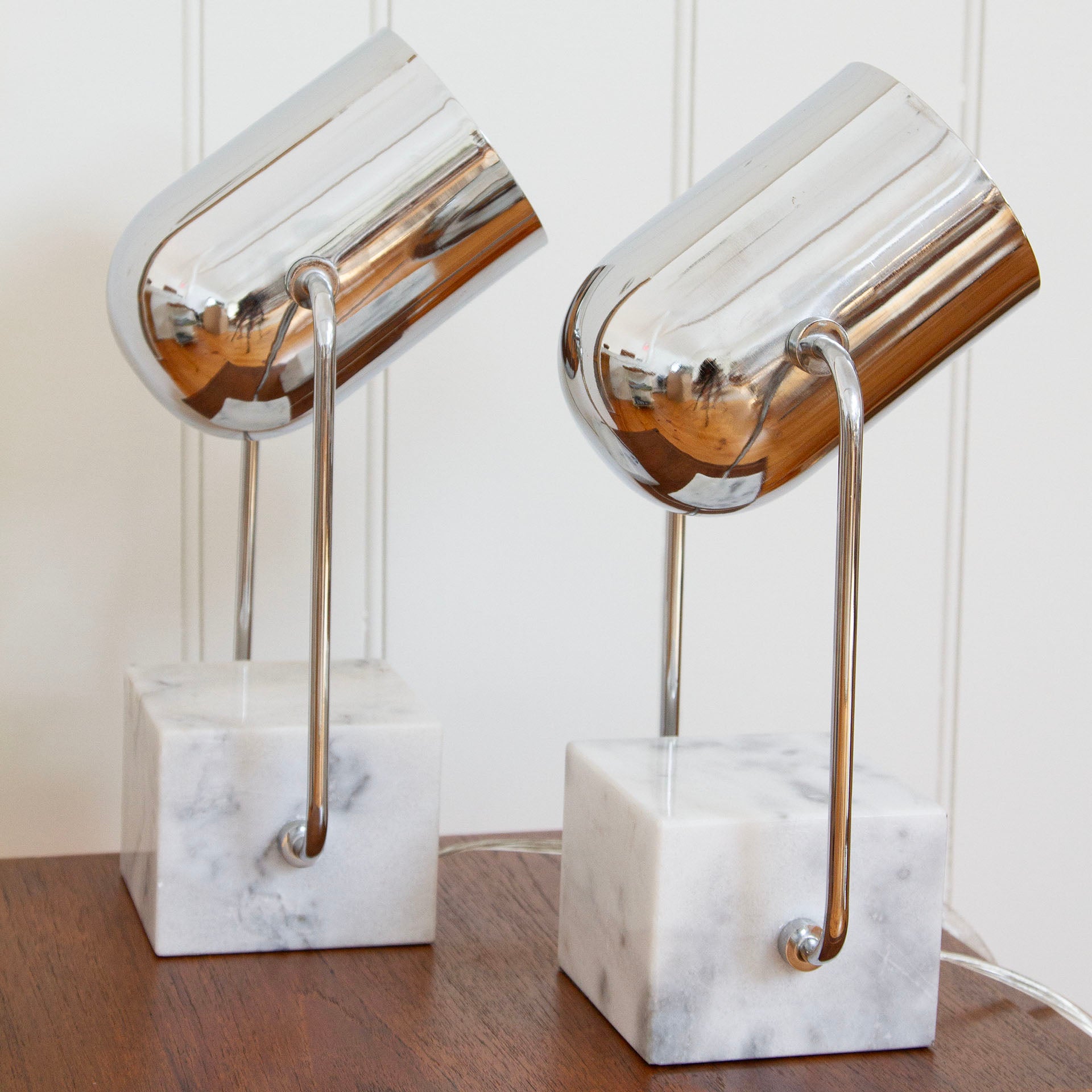 A pair of vintage chrome spotlights with a pivoting head on a square white marble base. Perfect for sitting on the floor or a table to cast light on an artwork.
