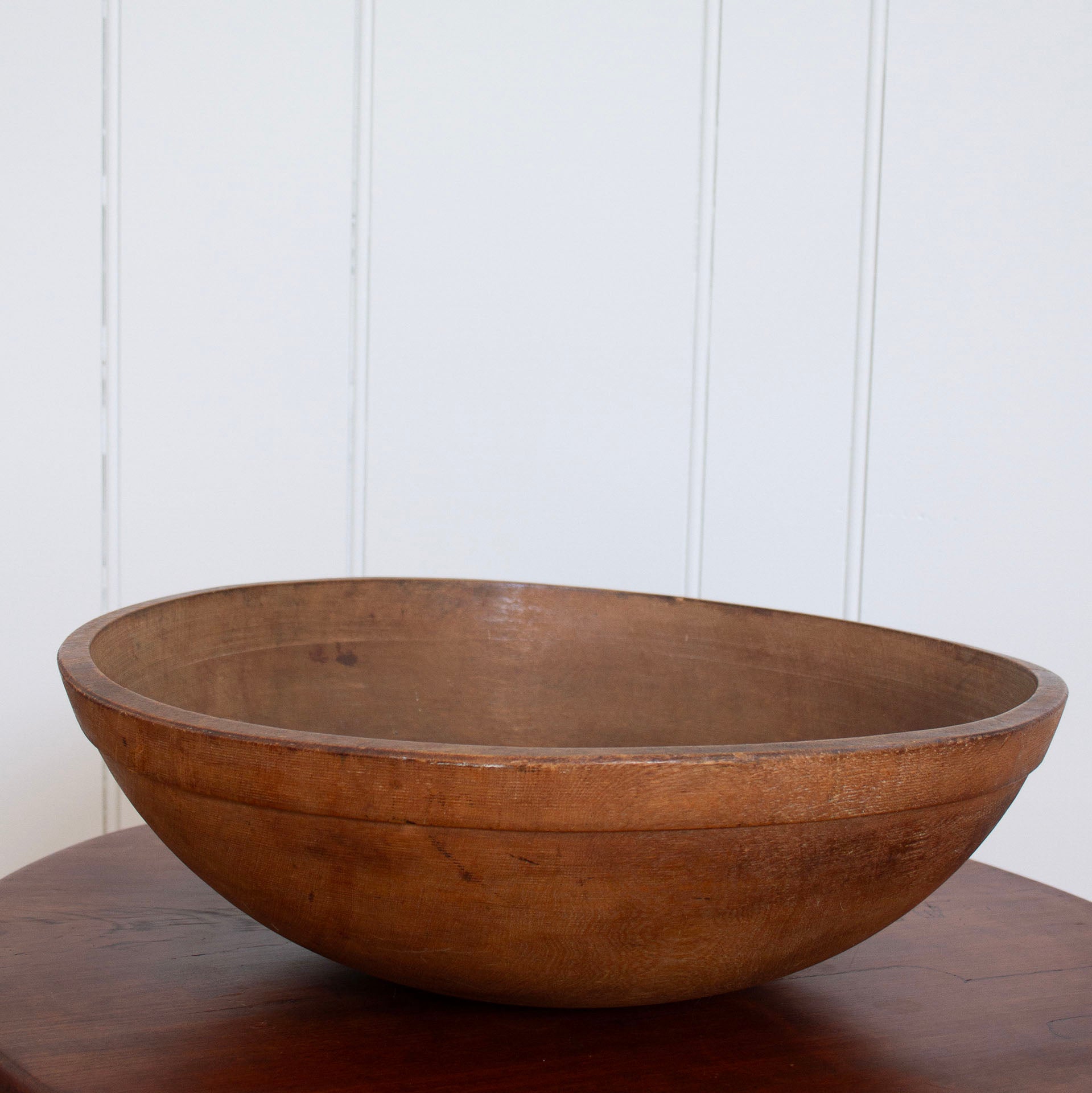 A beautiful hand turned wooden bowl with visible turning marks from the chisels. It shows the warm patina of time and makes for a perfect fruit or salad bowl.