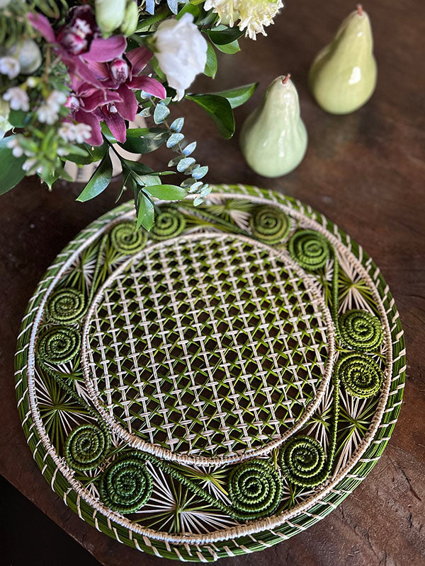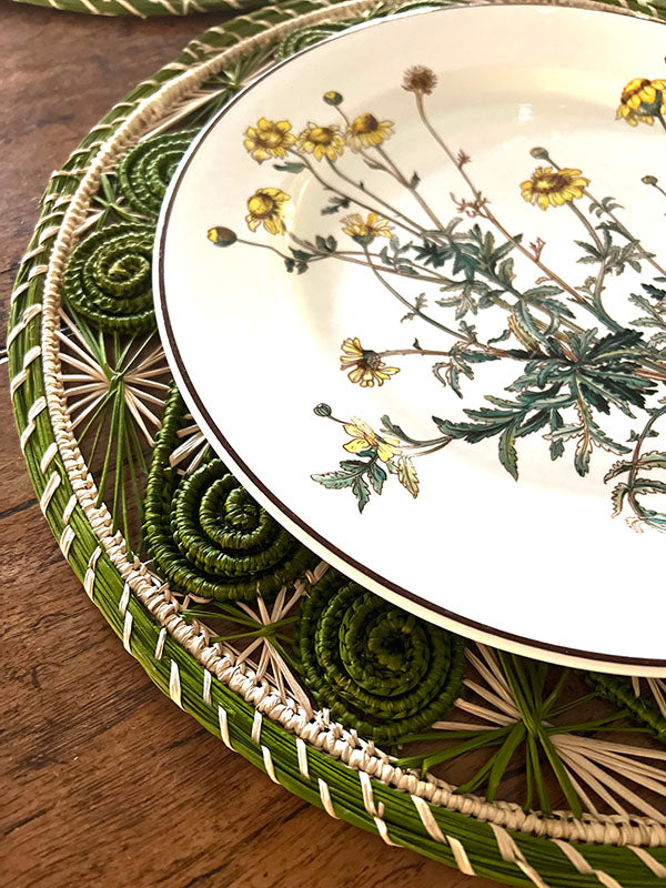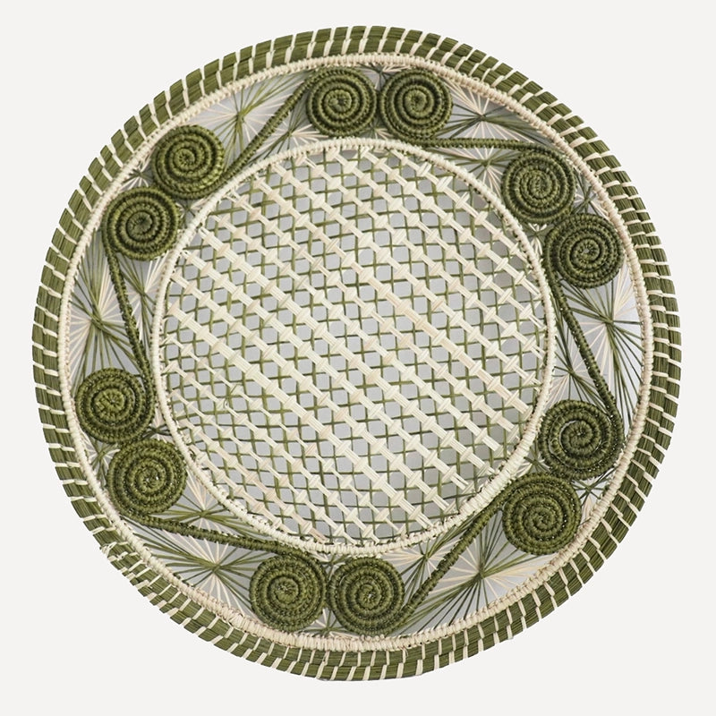 These olive and natural colored placemats are handwoven by master artisans in Colombia in intricate basketweave and spiral designs. Woven in iraca, a natural fiber, over a wire structure.