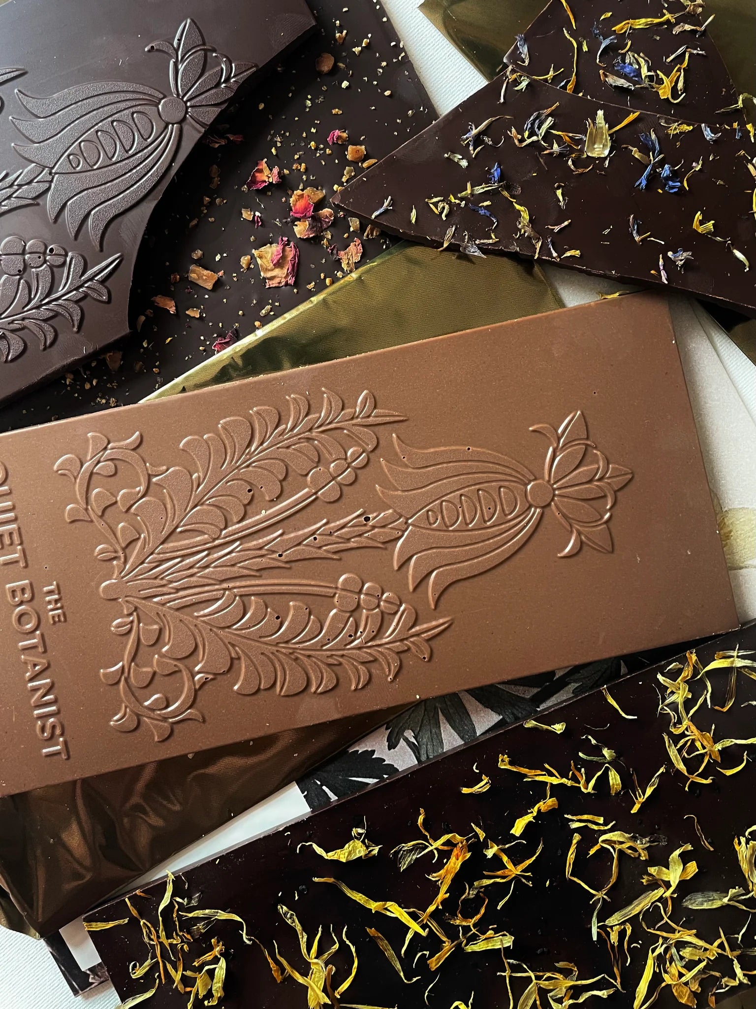 Wrapped in a vintage botanical print the large bar reveals a beautiful moody gold sleeve which then highlights the botanical stamped chocolate.